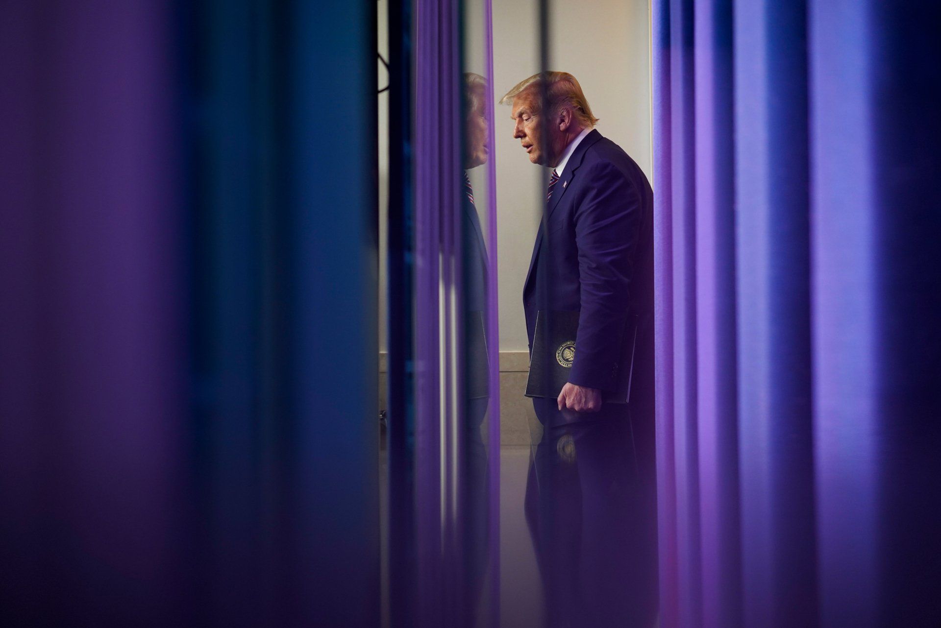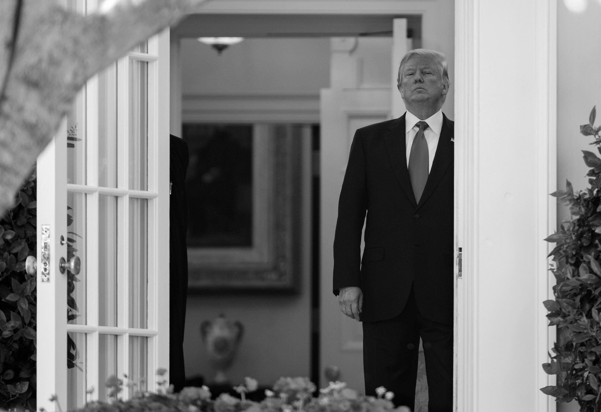 President Donald Trump pauses inside the Oval Office before a news conference with Nigerian President Muhammadu Buhari at the White House in Washington, Monday, April 30, 2018.