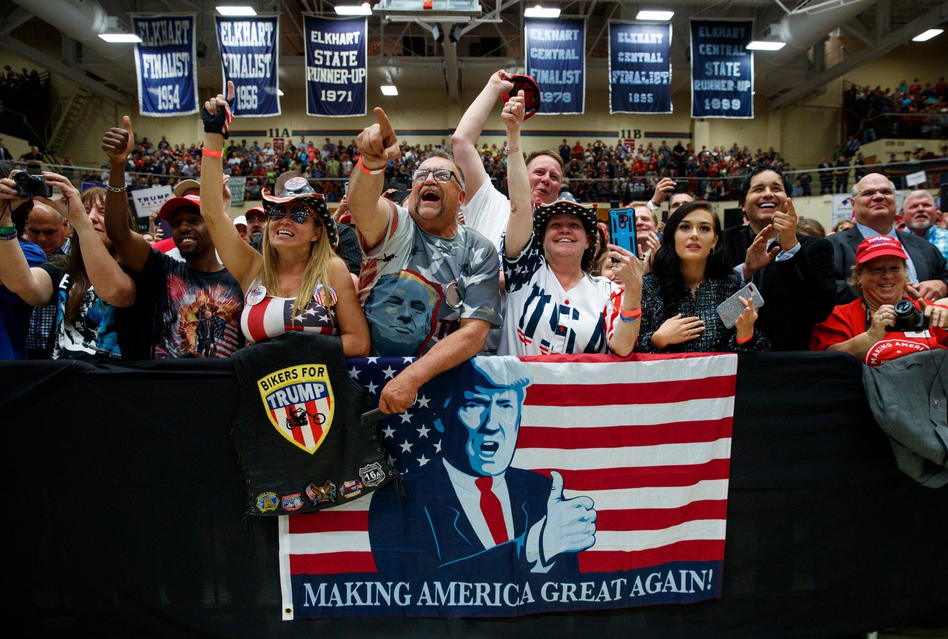 The crowd cheers at a campaign rally for President Donald Trump at the North Side Gymnasium in Elkhart, Ind., Thursday, May 10, 2018.