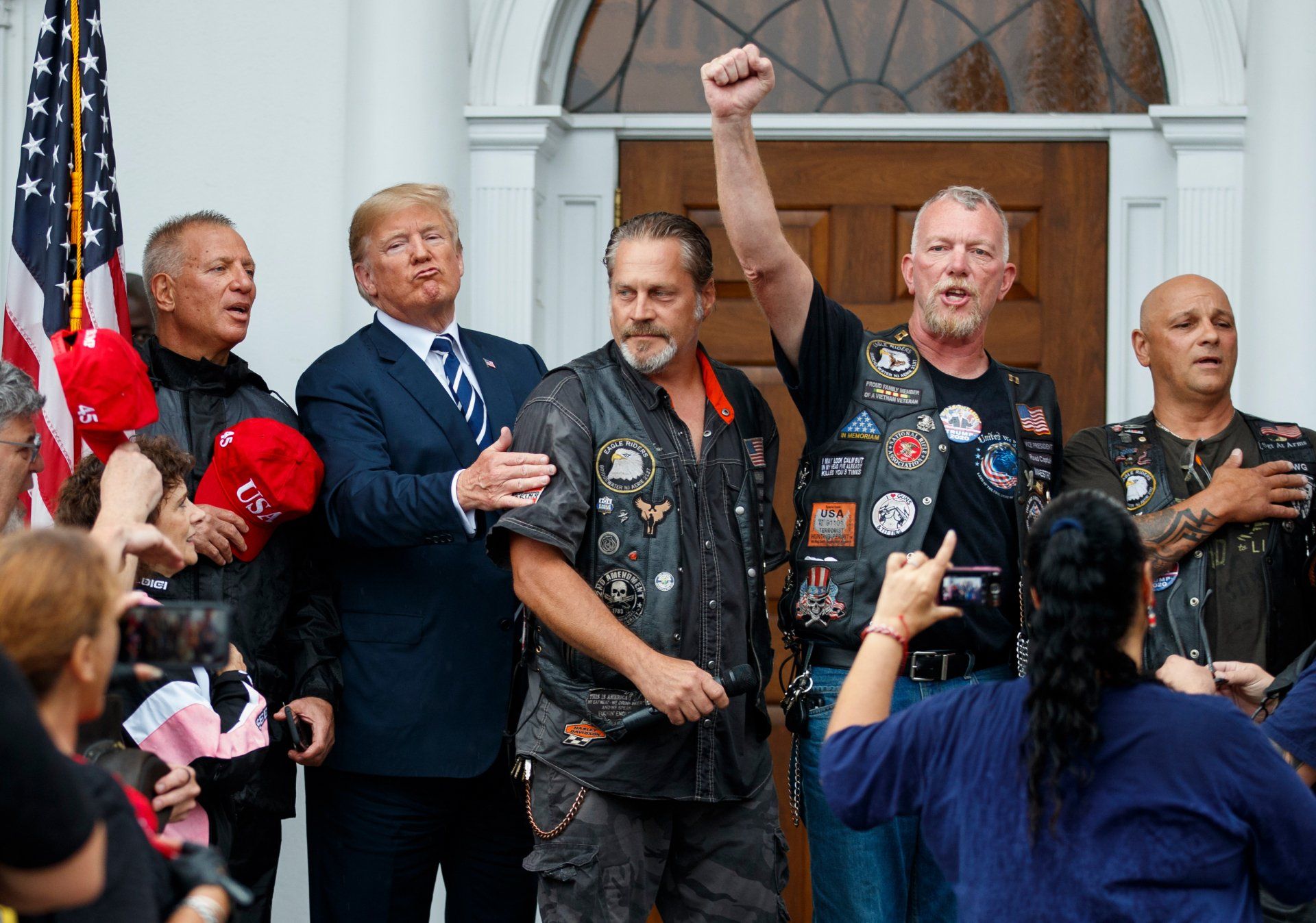 President Donald Trump stands in the rain with members of Bikers for Trump at Trump National Golf Club in Bedminster, N.J., Saturday, Aug. 11, 2018.