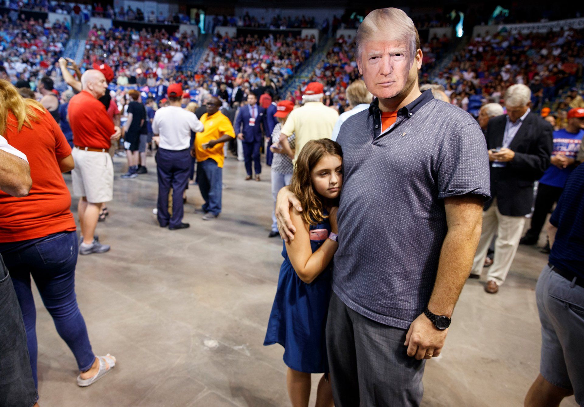 Thomas Musolino of Hazleton, Pa, wears a President Donald Trump mask as he stands with his daughter Gianna during a rally in Wilkes Barre, Pa., Thursday, Aug. 2, 2018.