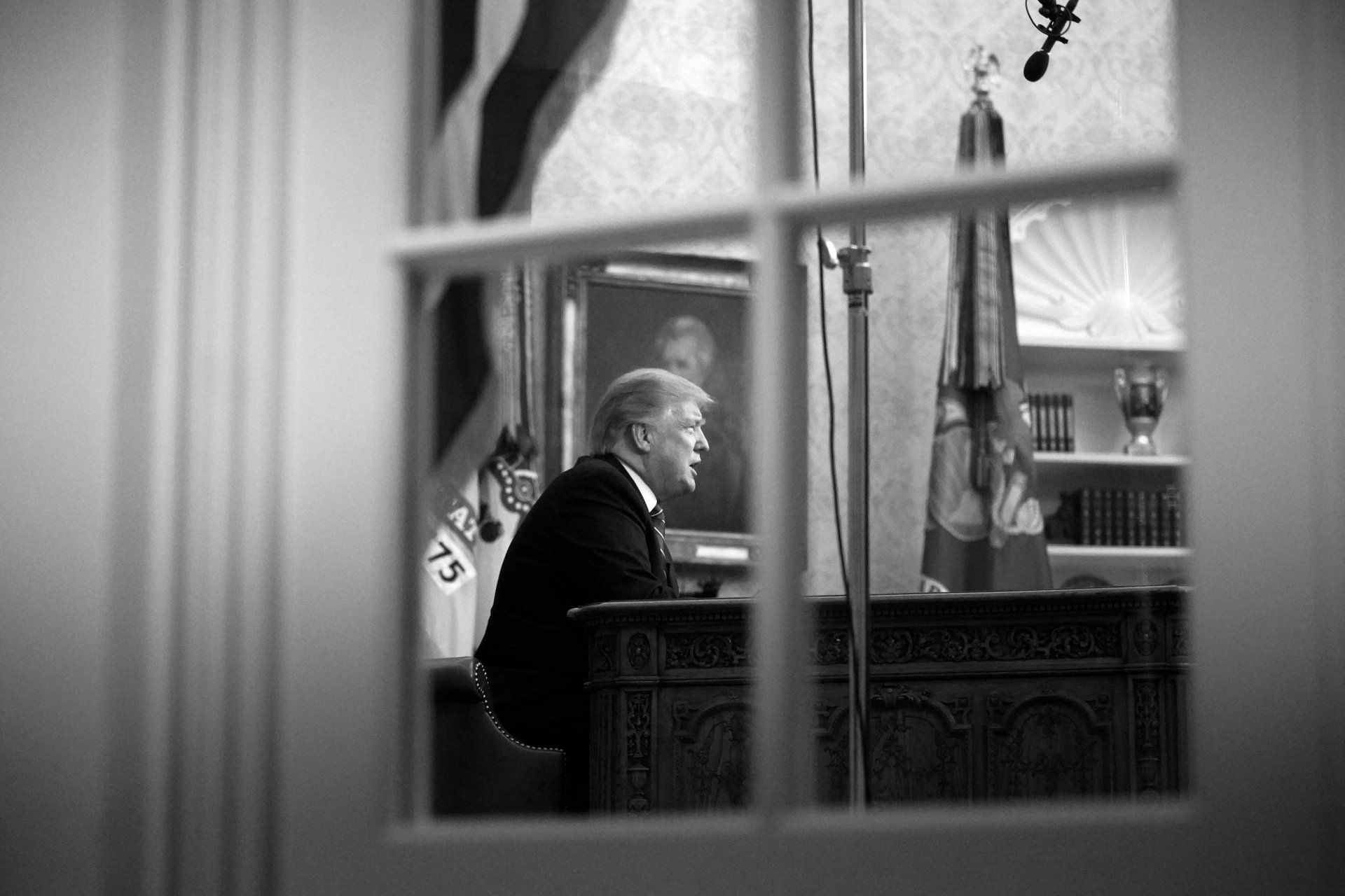 Seen through an Oval Office window, President Donald Trump gives a prime-time address at the White House in Washington, Tuesday, Jan. 8, 2018.