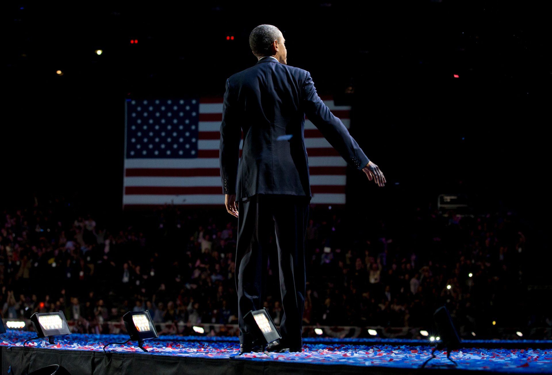 President Barack Obama looks to the cheering crowd as he leaves the stage on election night in Chicago, Wednesday, Nov. 7, 2012.