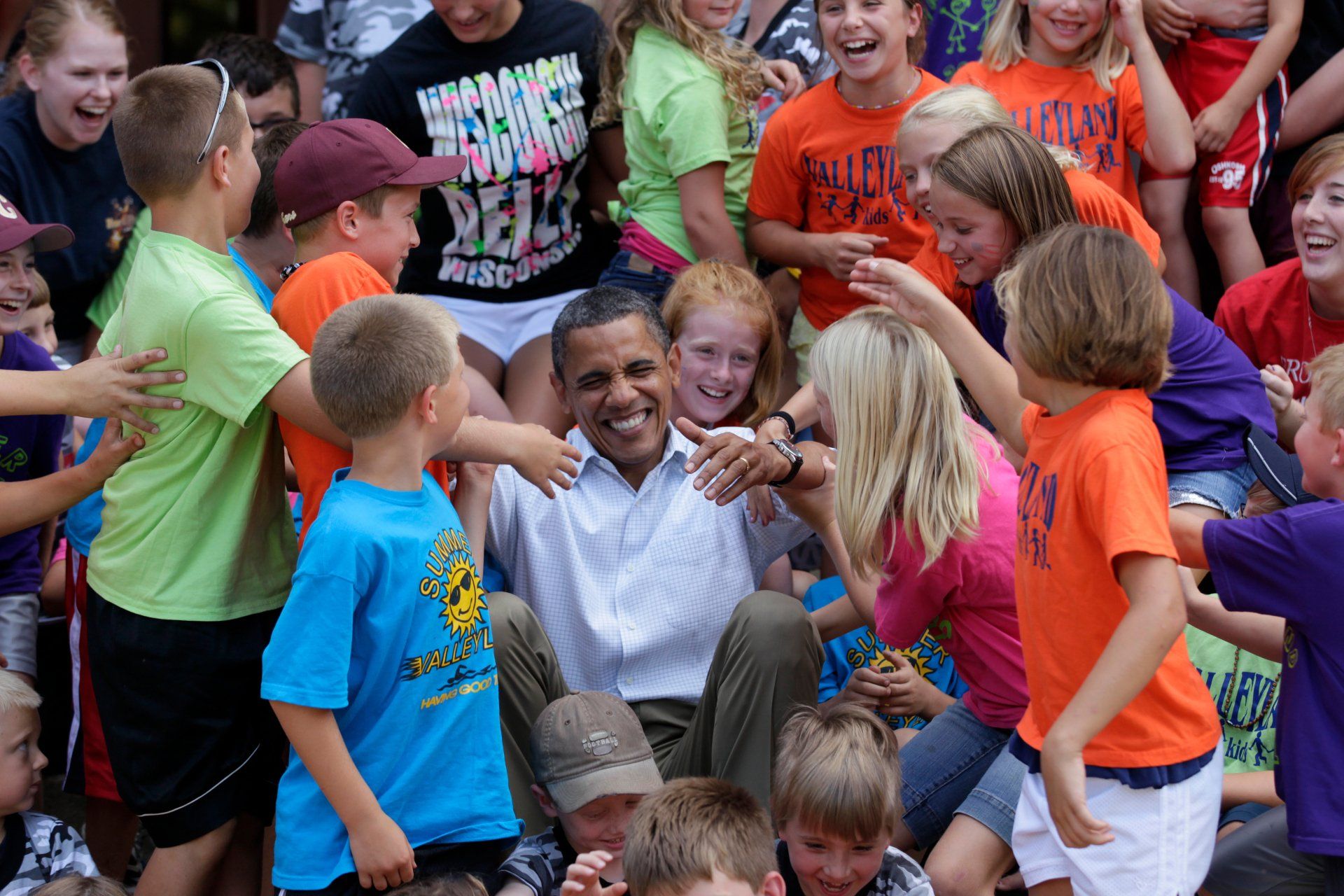 President Barack Obama is helped to his feet by summer school kids in Chatfield, Minn., Monday, Aug. 15, 2011.