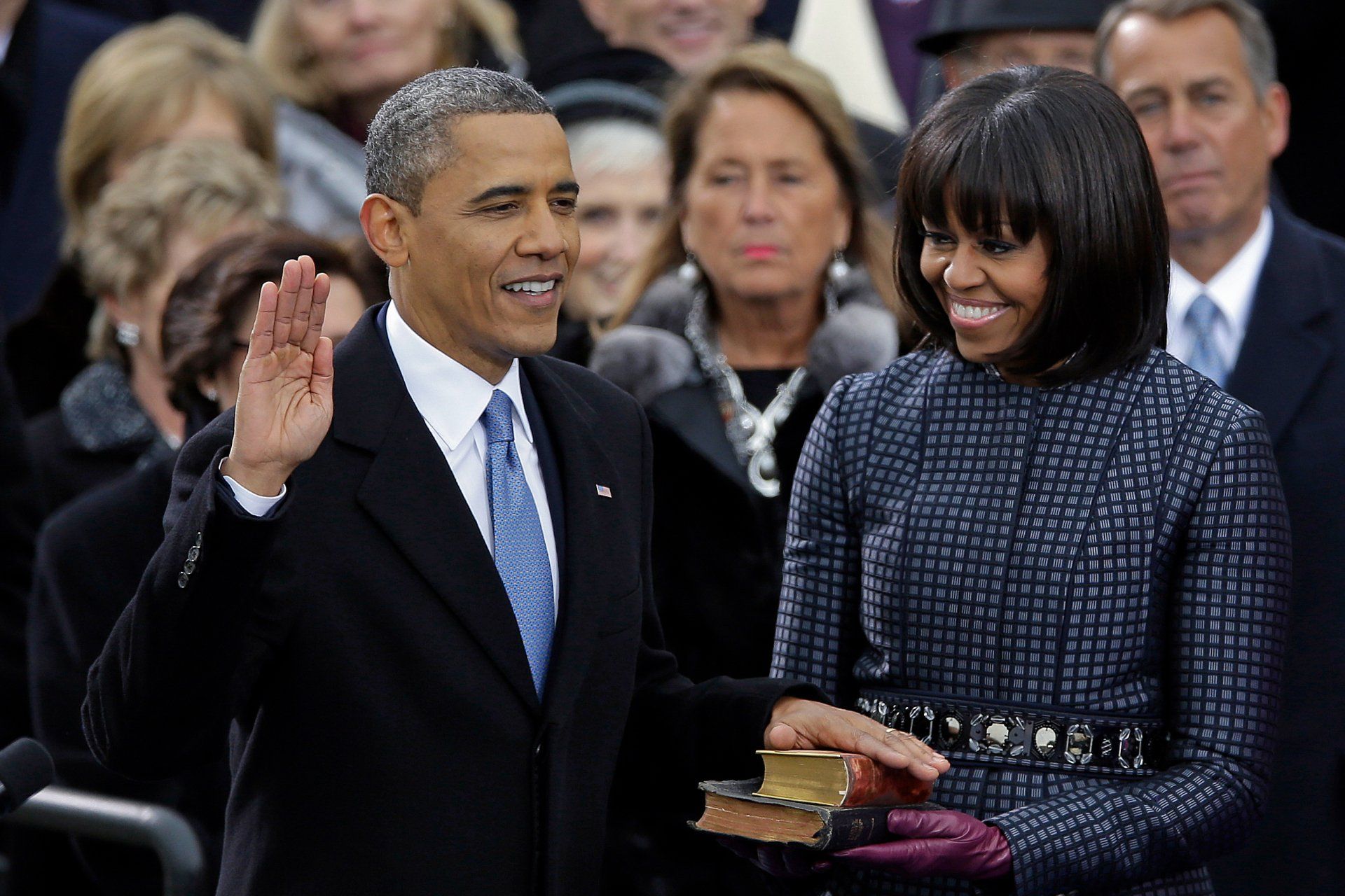 President Barack Obama receives the oath of office from Chief Justice John Roberts as first lady Michelle Obamas and his daughters Malia and Sasha look on at the ceremonial swearing-in at the U.S. Capitol during the 57th Presidential Inauguration in Washington, Monday, Jan. 21, 2013.