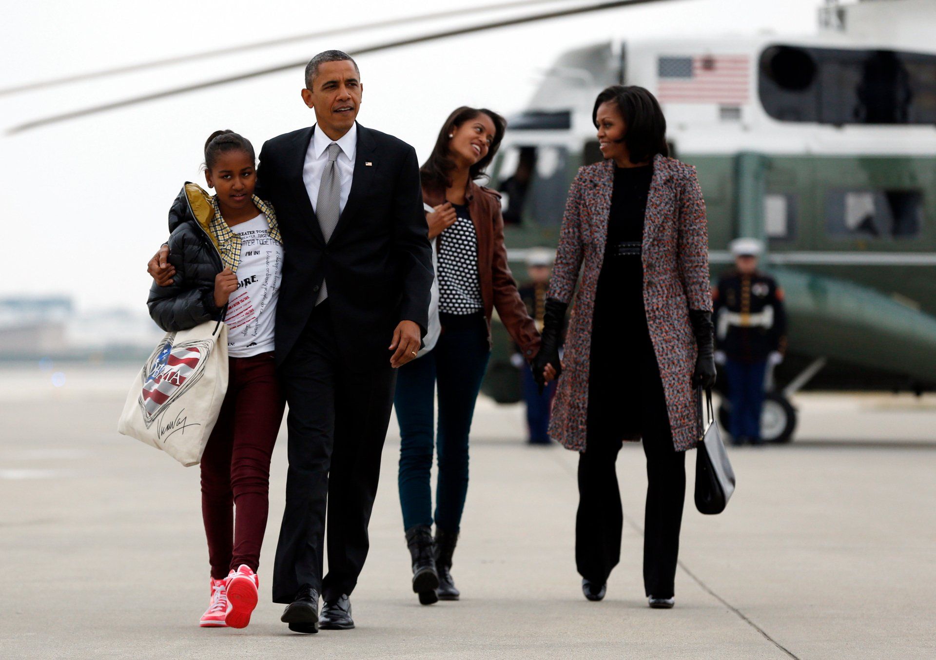 President Barack Obama, first lady Michelle Obama, and their daughters Sasha and Malia walk from Marine One to board Air Force One at Chicago O'Hare International Airport, Wednesday, Nov. 7, 2012.