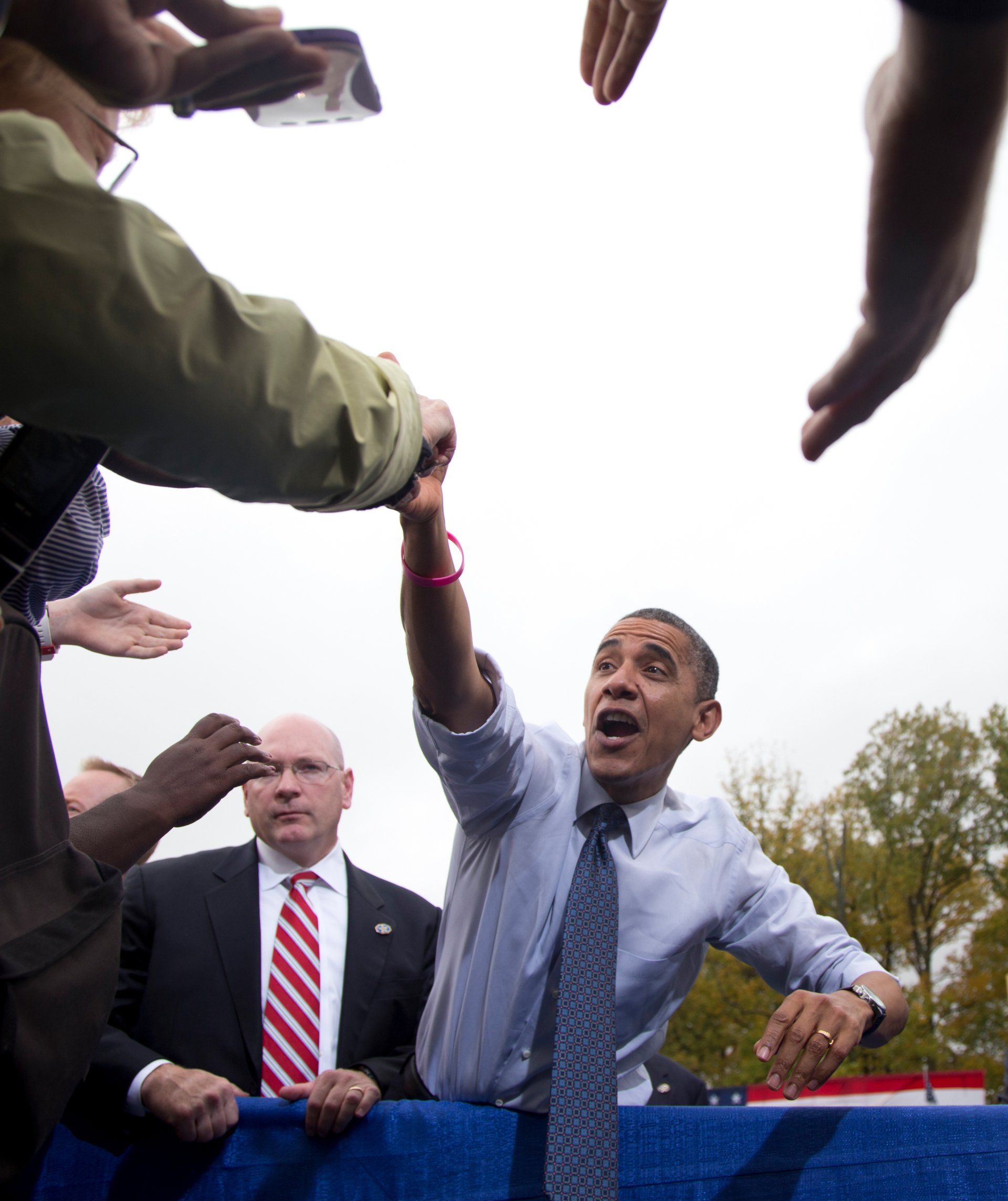 President Barack Obama stretches to shake hands at a campaign rally in Fairfax, Va., Friday, Oct. 19, 2012.