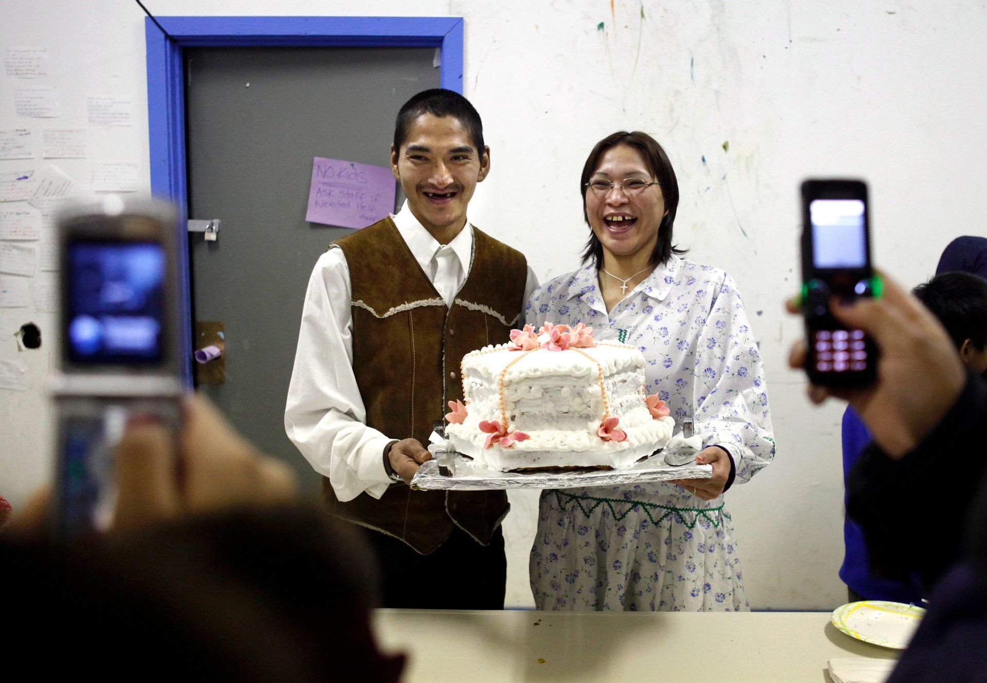Inupiat Eskimo newlyweds Alfred John Coffin and his Diana Coffin pose with their wedding cake in Noorvik, Alaska., Friday, Jan. 22, 2010.