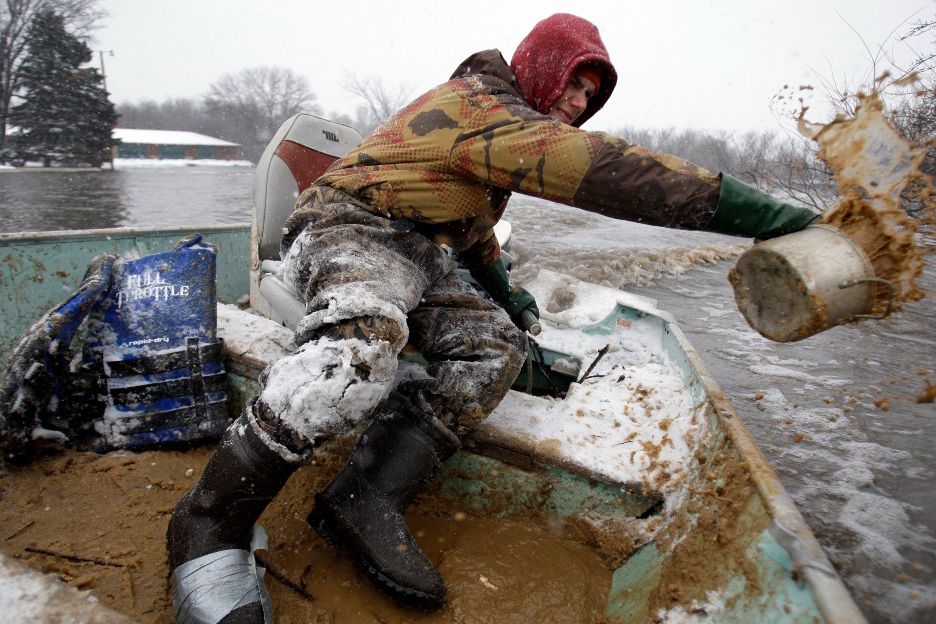 Michael Stensgard bails out his boat to bring sandbags to his family home as the Red River rises, Wednesday, March 25, 2009, in Fargo, N.D.