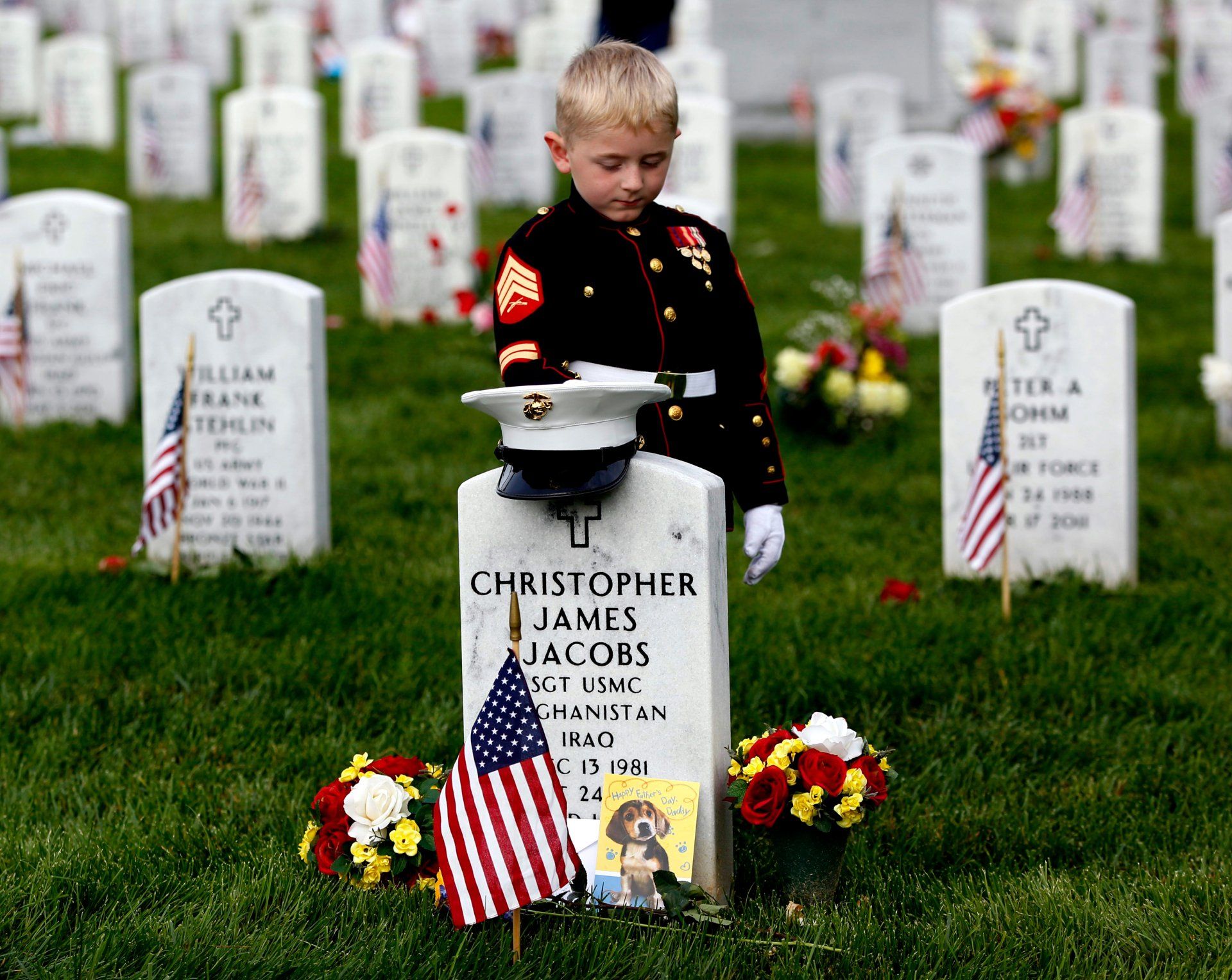 Christian Jacobs, 5, of Hertford, N.C., dressed as a Marine, stands at his father's gravestone on Memorial Day at Arlington National Cemetery in Arlington, Va., Monday, May 30, 2016. Christian's father, Marine Sgt. Christopher James Jacobs died in a training accident in 2011.