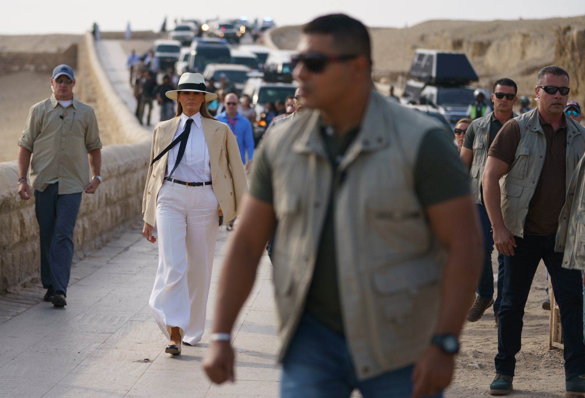 First lady Melania Trump walks with security at the Giza Pyramids in Giza, near Cairo, Egypt. Saturday, Oct. 6, 2018