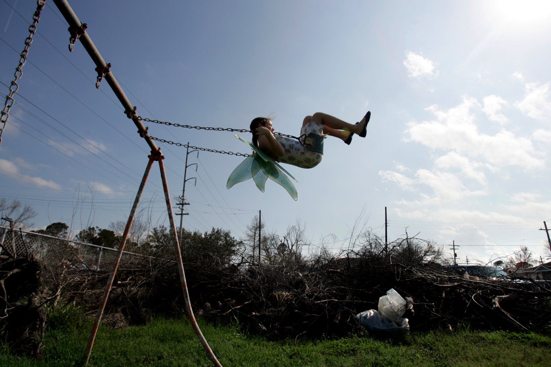 Angel wings for the Krewe of Druex Mardi Gras parade glow as Nysa Loudon, 11, swings in the neighborhood park ravaged by Hurricane Katrina near her home in Gentilly area of New Orleans, La., Feb. 25, 2006.