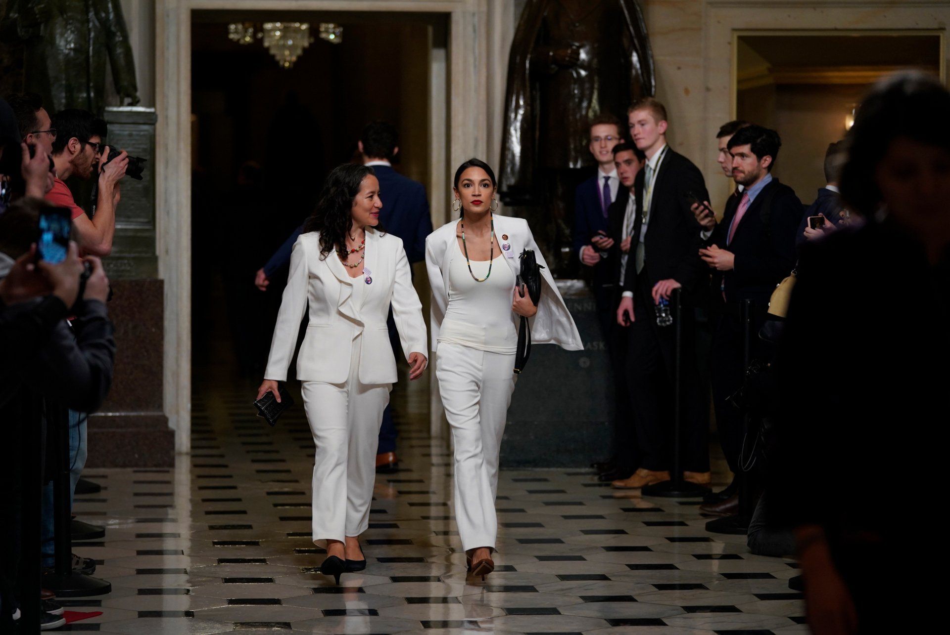 Rep. Alexandria Ocasio-Cortez, D-N.Y., right, arrives with Ana Maria Archila of New York, for President Donald Trump’s State of the Union address in Washington on Tuesday, Feb. 5, 2019.