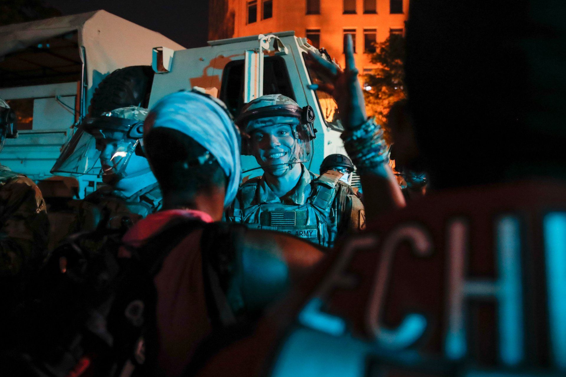 A South Carolina National Guard soldier stands on a police line as demonstrators gather to protest the death of George Floyd, Wednesday, June 3, 2020, near the White House in Washington.