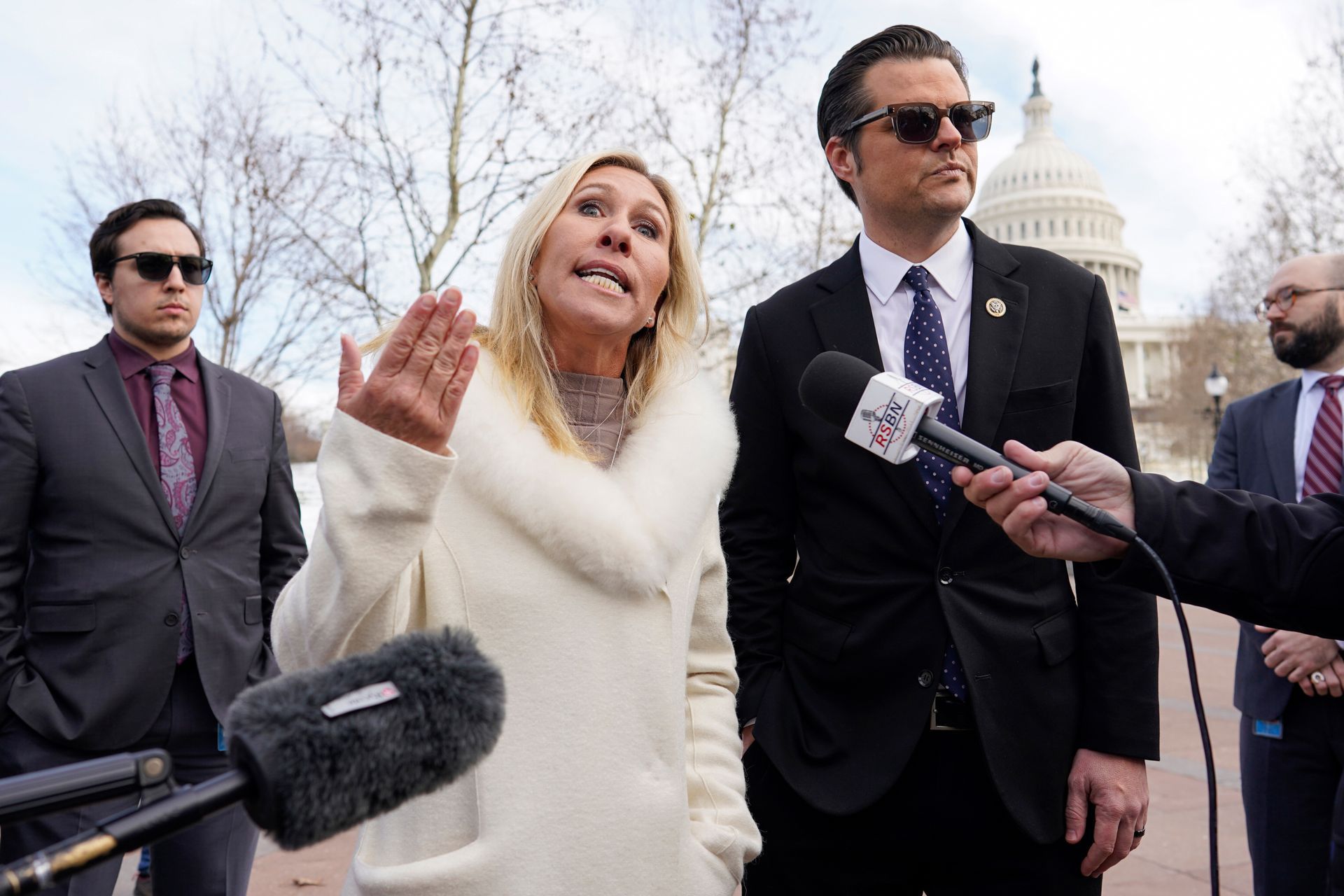 Rep. Marjorie Taylor Greene, R-Ga., and Rep. Matt Gaetz, R-Fla., speak at the U.S. Capitol in Washington, Thursday, Jan. 6, 2022, on the one-year anniversary of the U.S. Capitol attack.