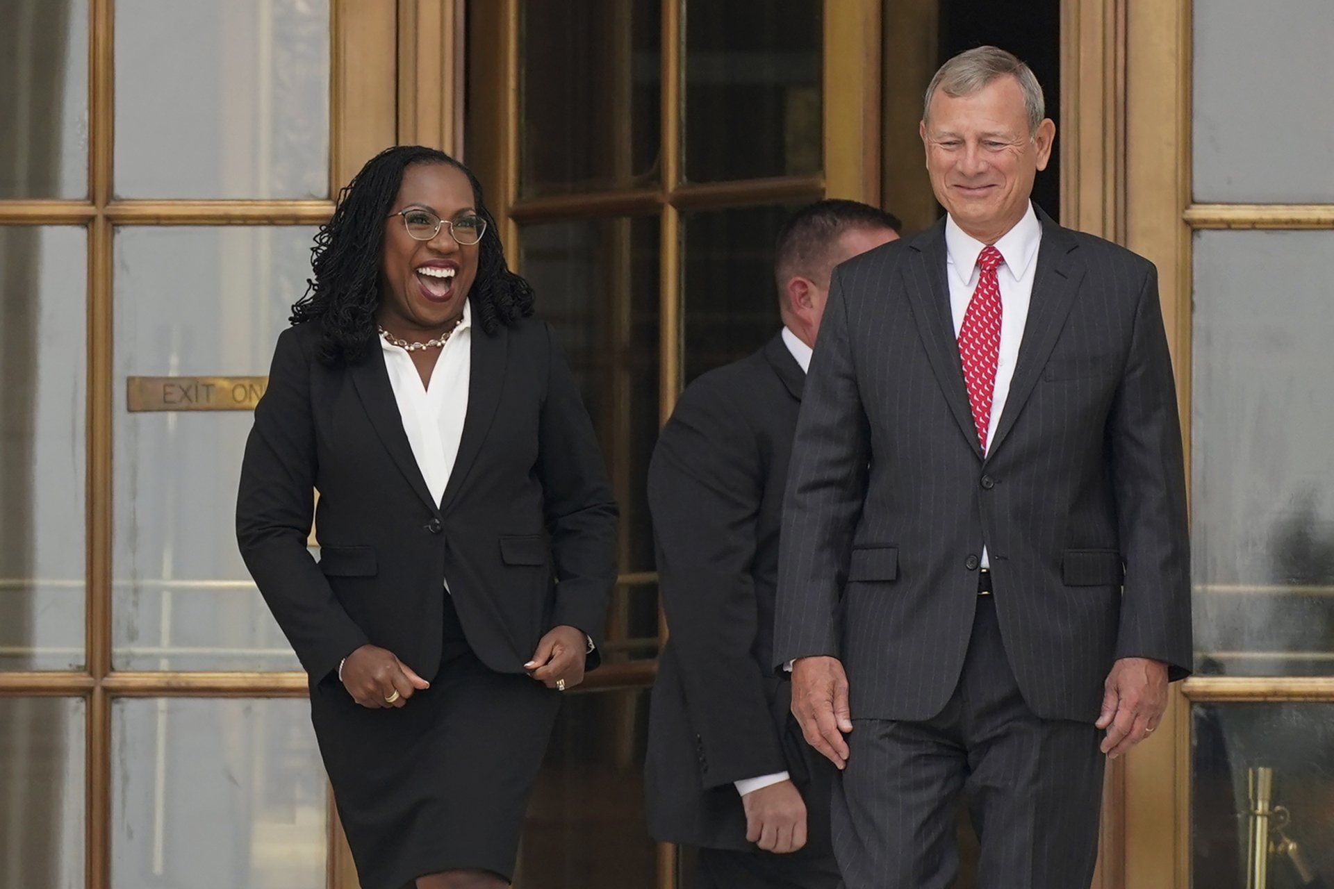 Supreme Court Associate Justice Ketanji Brown Jackson and Chief Justice of the United States John Roberts walk from the Supreme Court following her formal investiture ceremony in Washington, Friday, Sept. 30, 2022.