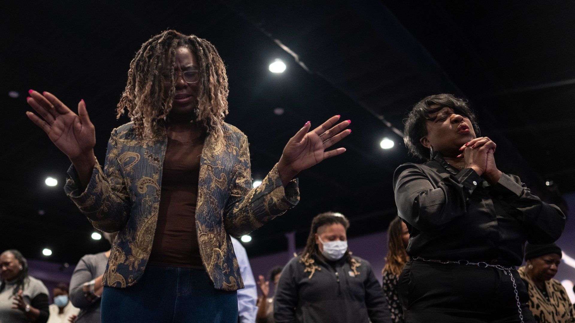 Maurene Bullock, left, and Dr. Angela Coprew-Boyd, pray at Chesapeake Coalition of Black Pastors at The Mount (Mount Lebanon Baptist Church) in Chesapeake, Va., Sunday, Nov. 27, 2022, for the six people shot and killed at a Walmart in Chesapeake, Va.