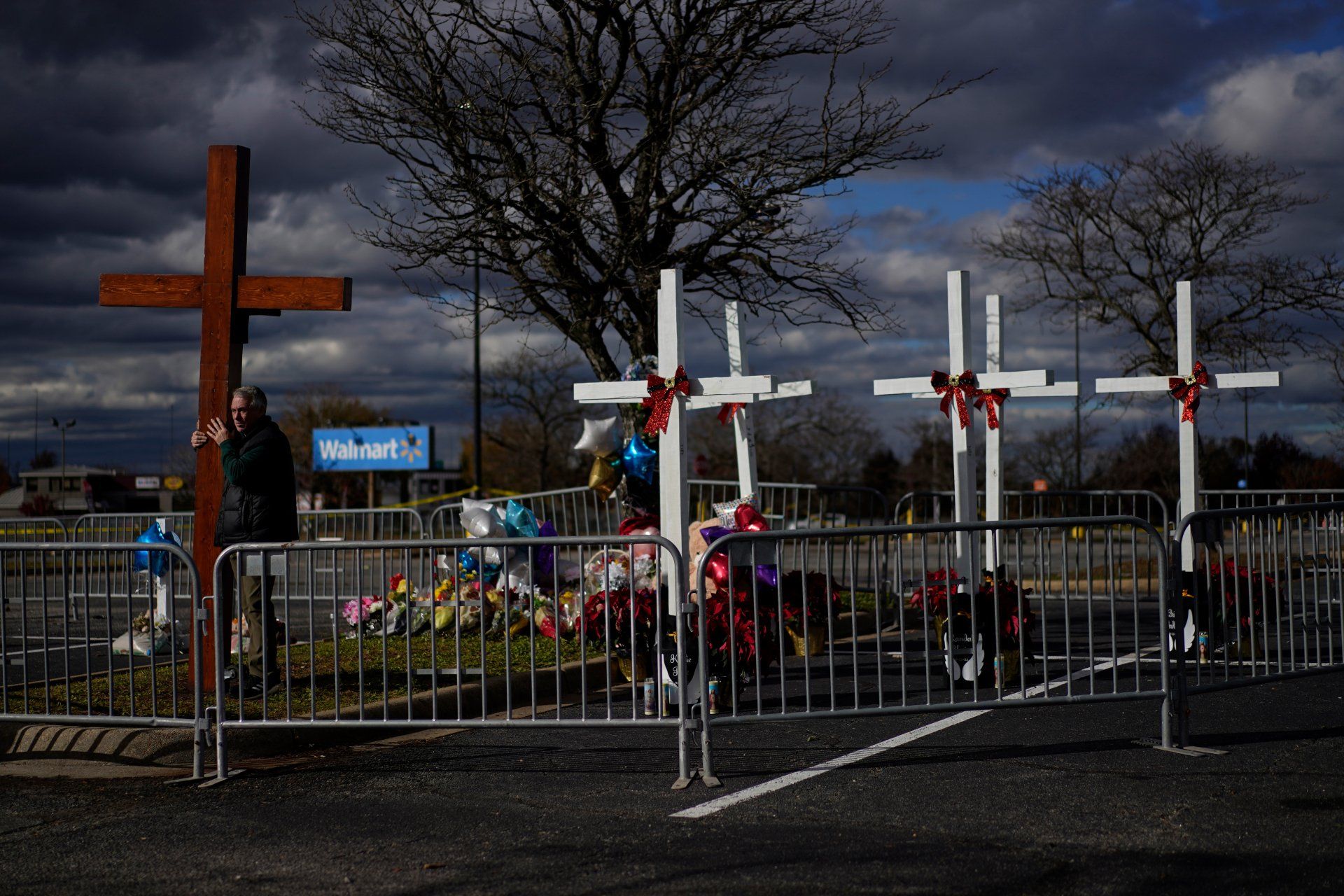 Dan Beazley supports a large wooden cross that he brought from his home in Detroit, Mich., in the parking lot of a Walmart in Chesapeake, Va., Monday, Nov. 28, 2022, for the six people shot and killed there.