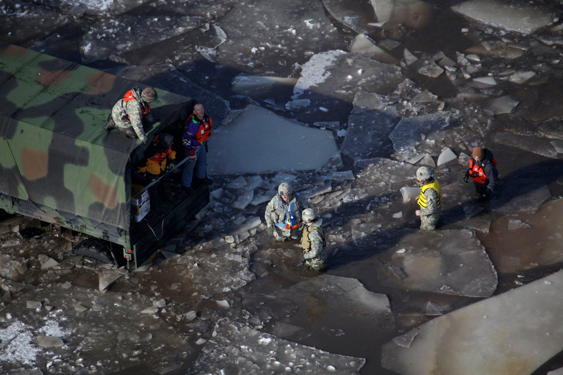 National Guard personnel walk in the high icy floodwater to evacuate residents as the Red River continues to rise in Fargo, N.D. Saturday, March 28, 2009.