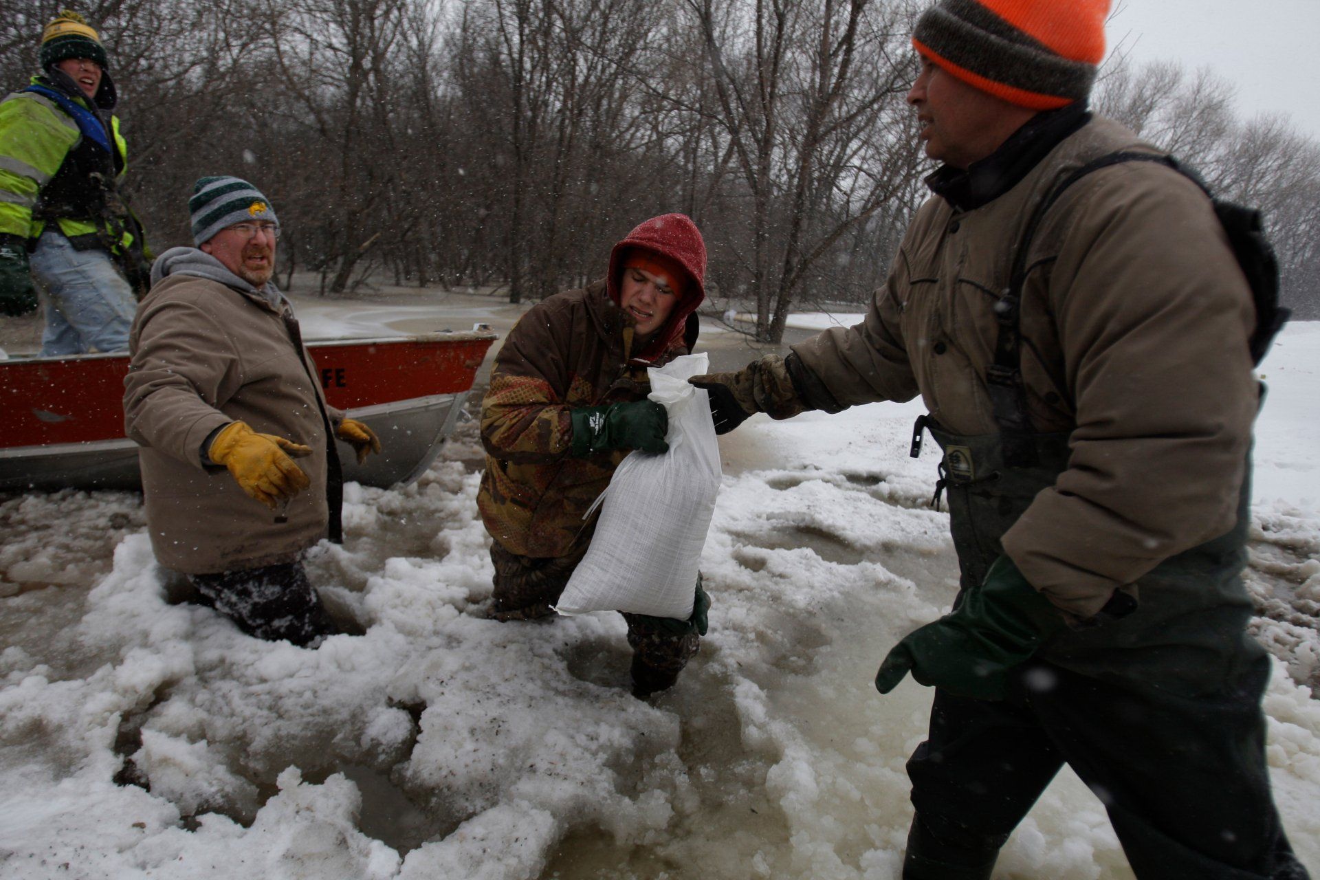 From left, Jack Lubka, Dale Cardwell, Michael Stensgard and Doug Stensgard load sandbags into a boat as the Red River rises, Wednesday, March 25, 2009, in Fargo, N.D.
