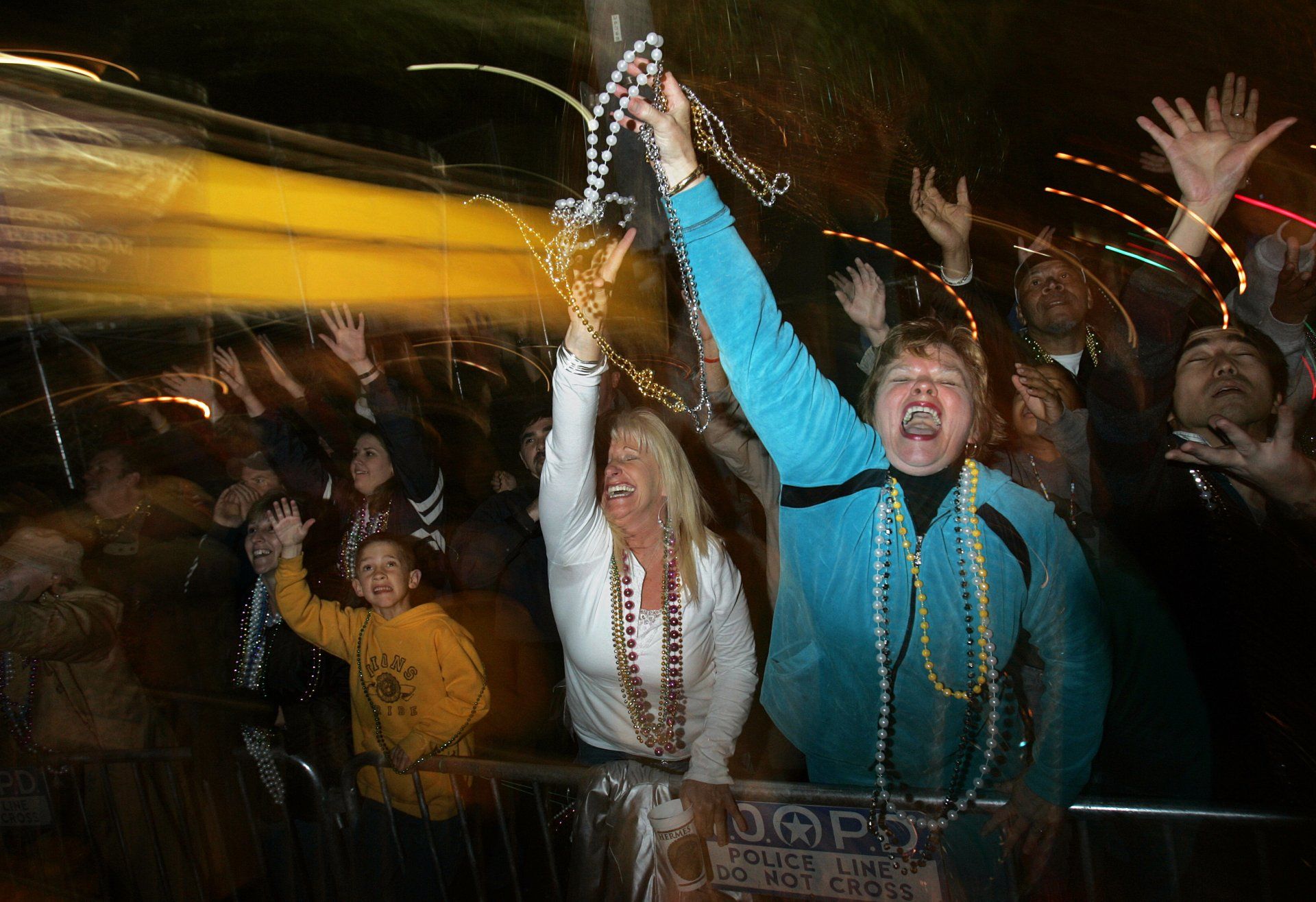 Sisters Alevia Solomon, left, from Lucedale, Miss., and Julie Ellis, from Indianola, Miss., reach up and grab flying Mardi Gras beads during the Hermes Parade on St. Charles Ave. in New Orleans, Friday, Feb. 24, 2006.