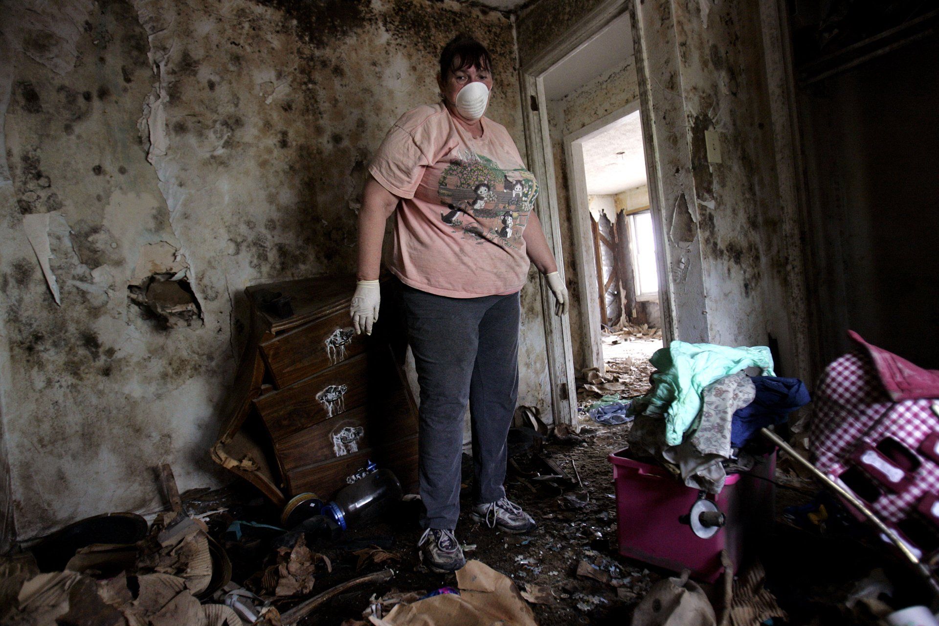 Lois Ledet clears wet and moldy clothing from her Arabi, La., home just outside of New Orleans, Tuesday, Feb. 21, 2006, devastated by Hurricane Katrina almost six months earlier.