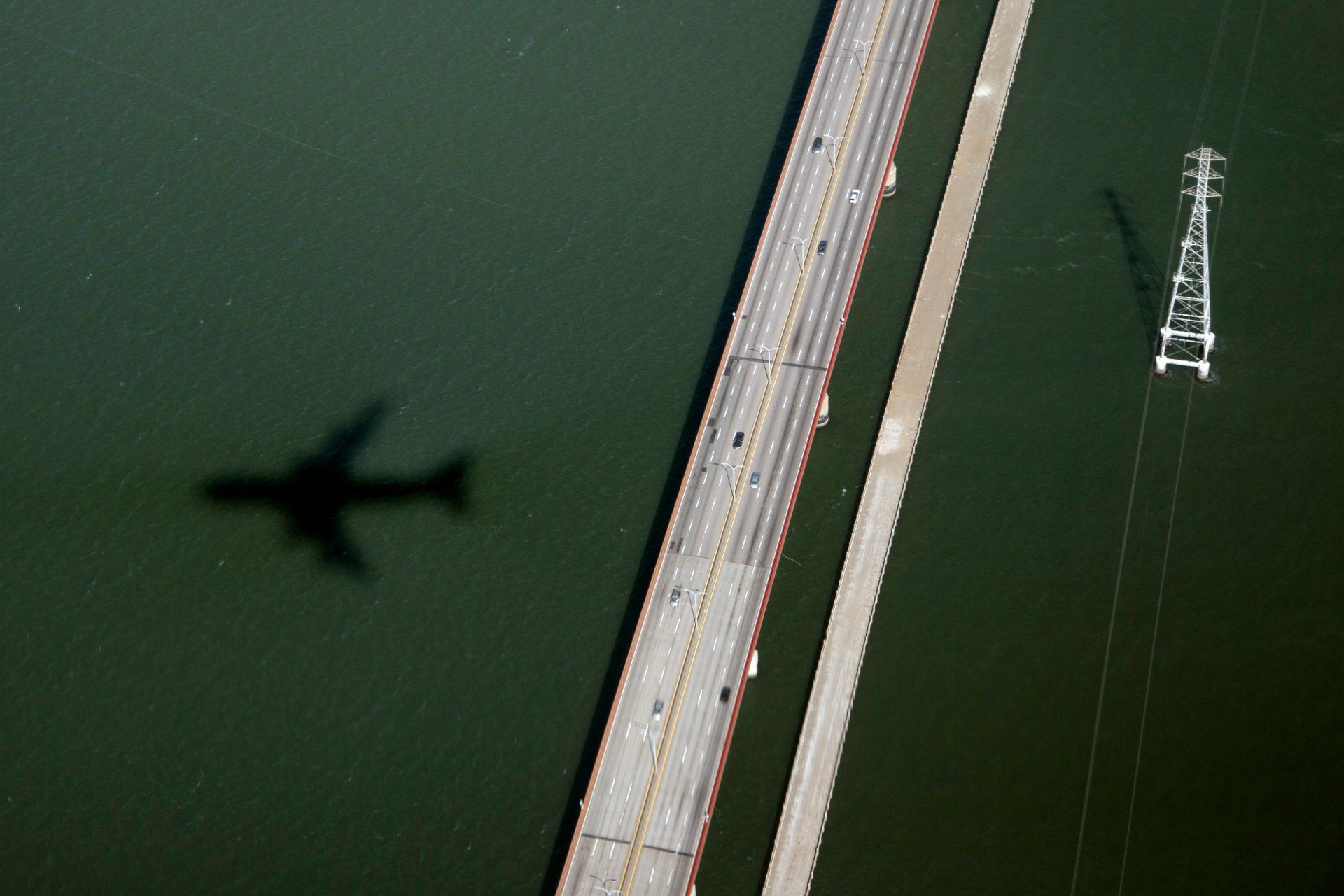 The shadow of Air Force One, with President Barack Obama aboard, over the San Mateo Bridge and San Francisco Bay, Monday, Oct. 8, 2012.