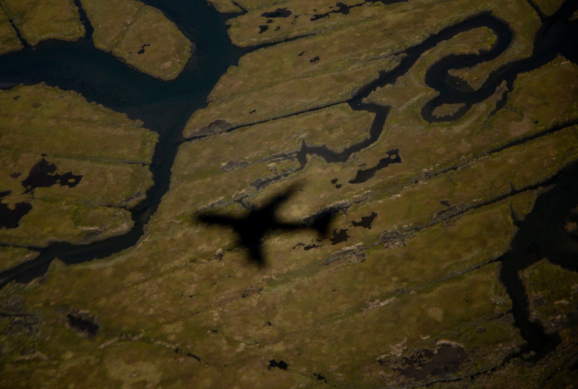 The shadow of Air Force One, with President Barack Obama aboard, in Everett, Washington, Tuesday, April 22, 2014.