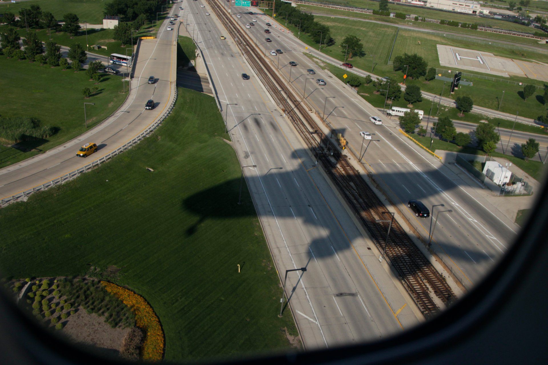The shadow of Air Force One, with President Barack Obama aboard, on approach to Chicago O'Hare International Airport, Wednesday, Aug. 3, 2011.