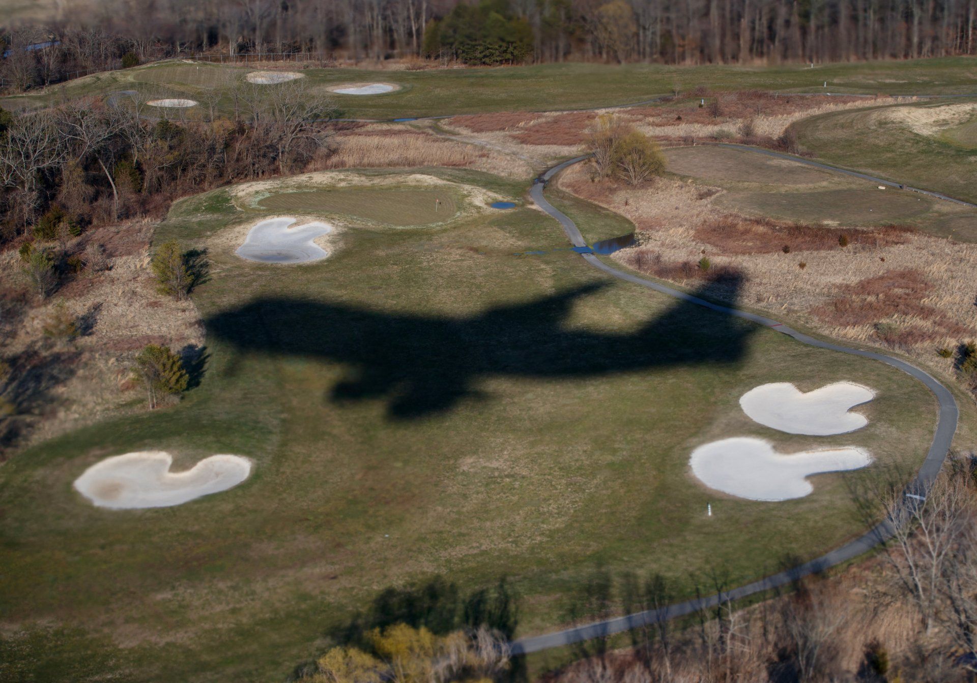 The shadow of Air Force One, with President Donald Trump aboard, on the golf course at Andrews Air Force Base, Md., Sunday, March 25, 2018.