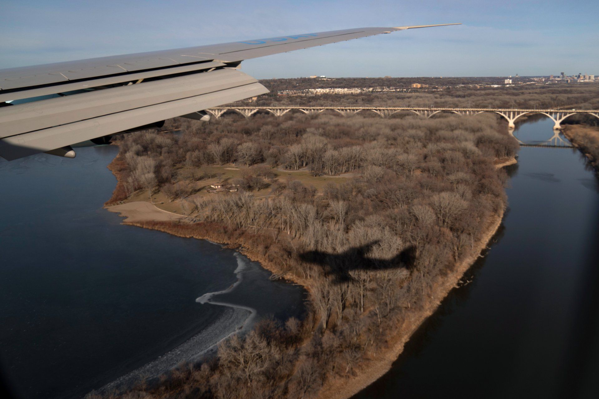 The shadow of Air Force One, with President Joe Biden aboard, on approach over the Mississippi River to Minneapolis-Saint Paul International, Tuesday, Nov. 30, 2021.