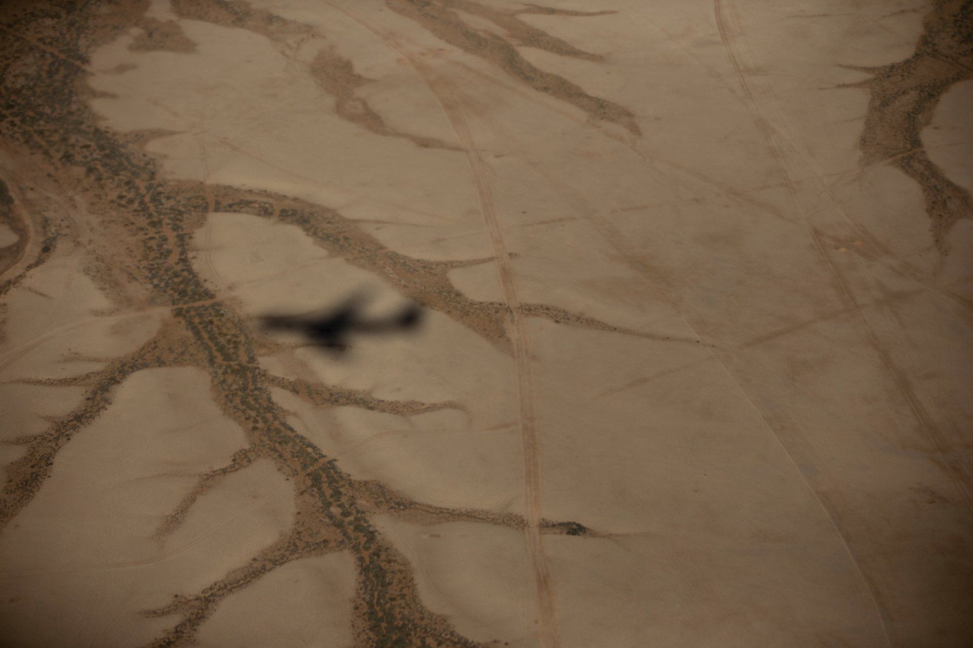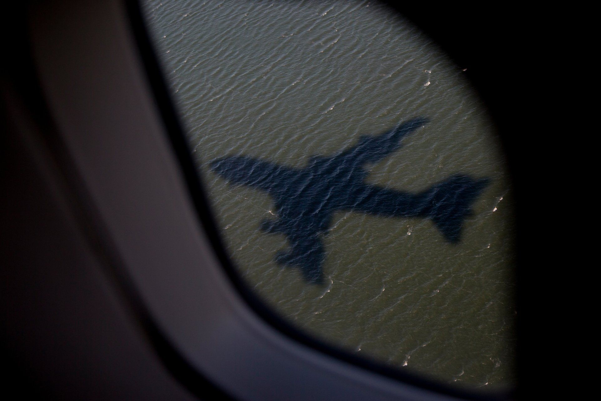 The shadow of Air Force One, with President Barack Obama and first lady Michelle Obama aboard, on approach to King Khalid International Airport, in Riyadh, Saudi Arabia, Tuesday, Jan. 27, 2015.