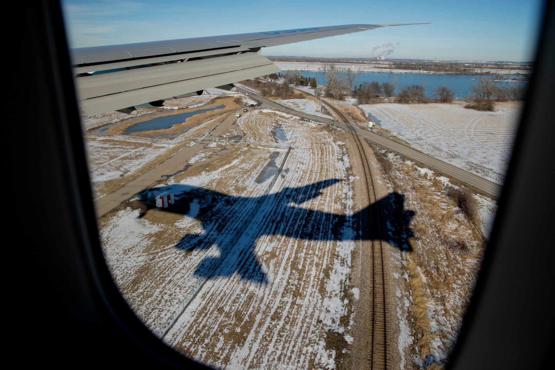 The shadow of Air Force One, with President Barack Obama aboard, on approach to Offutt Air Force Base in Bellevue, Neb., Wednesday, Jan. 13, 2016.
