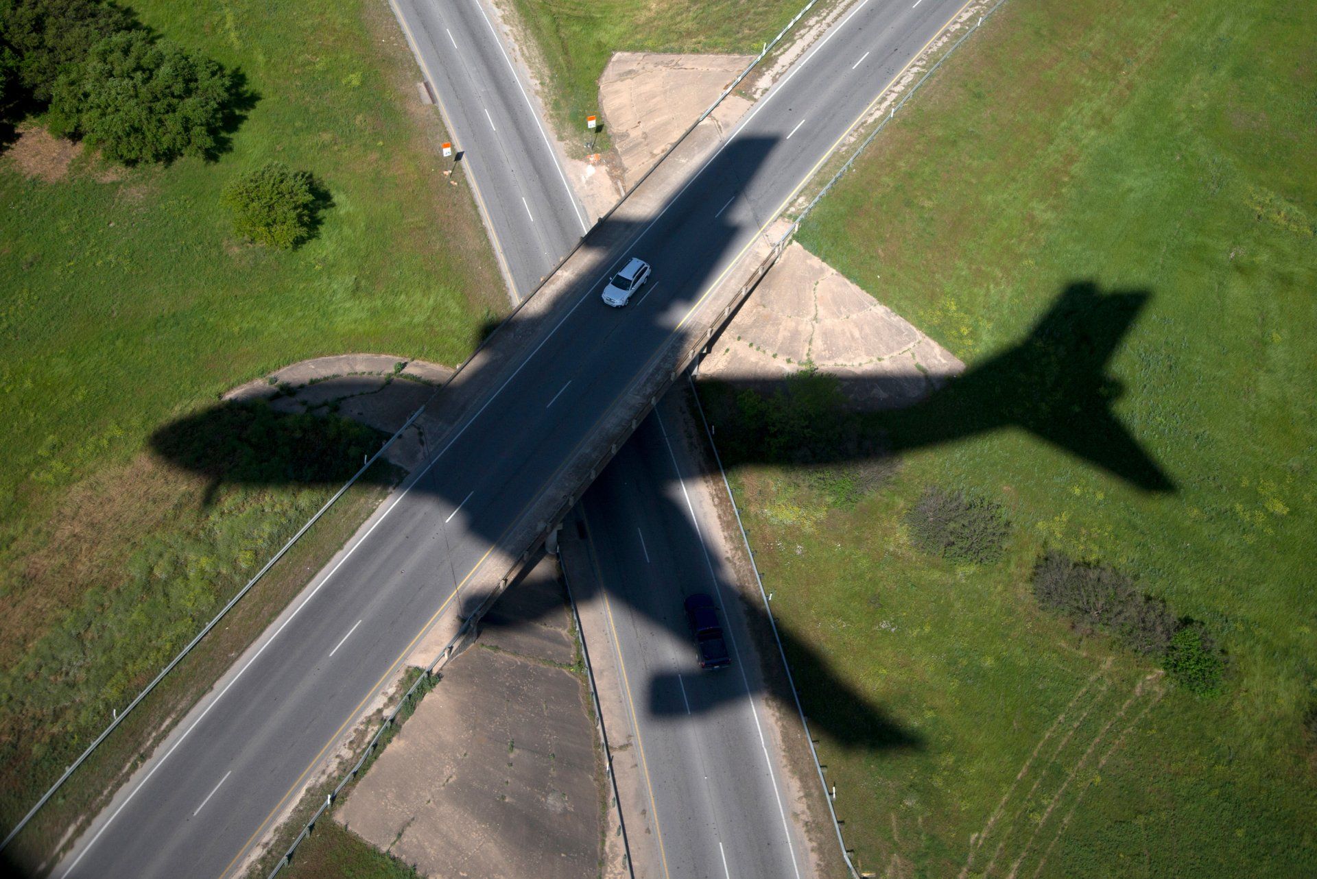 The shadow of Air Force One, with President Barack Obama and first lady Michelle Obama aboard, in Austin, Texas, Thursday, April 10, 2014.