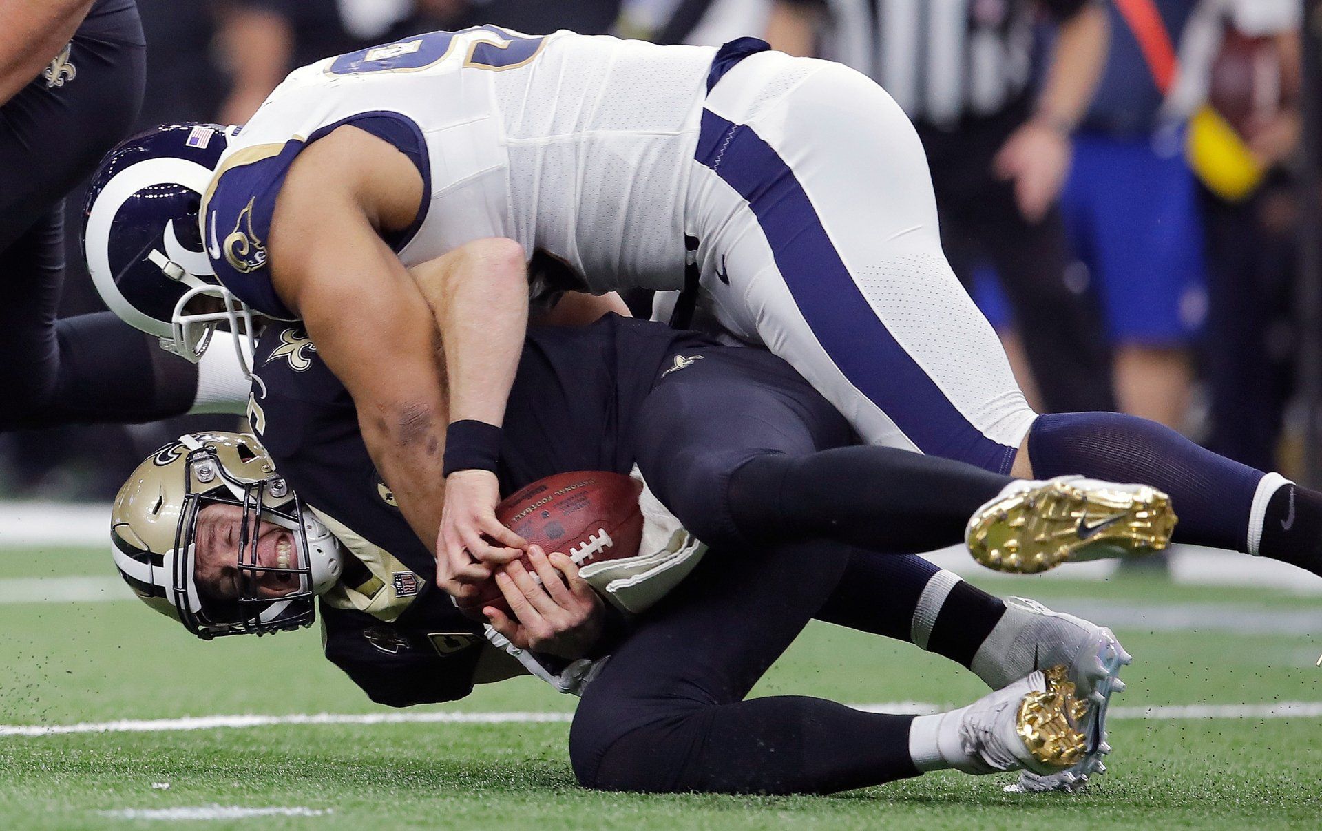 New Orleans Saints' Drew Brees is sacked by Los Angeles Rams' Ndamukong Suh during the first half of the NFL football NFC championship game, Sunday, Jan. 20, 2019, in New Orleans.
